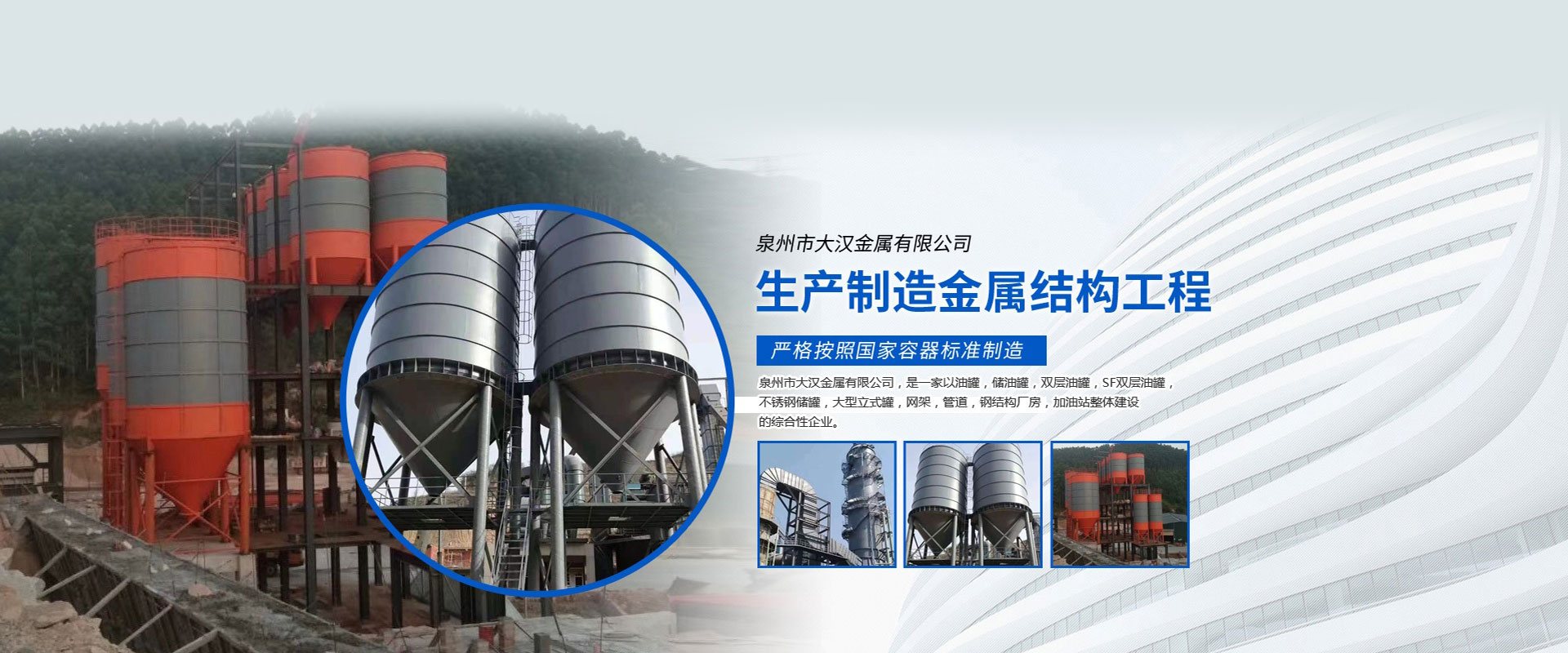 泉州市大漢金屬有限公司,是一家以油罐、儲(chǔ)油罐、雙層油罐、SF雙層油罐、不銹鋼儲(chǔ)罐、大型立式罐、網(wǎng)架、管道、鋼結(jié)構(gòu)廠房、加油站整體建設(shè)的綜合性企業(yè)。本公司以技術(shù)人員、施工經(jīng)驗(yàn)豐富的工程隊(duì)、自動(dòng)化設(shè)備、擁有鋼結(jié)構(gòu)建筑、螺栓球網(wǎng)架設(shè)計(jì)安裝技術(shù)力量,嚴(yán)格按照國(guó)家容器標(biāo)準(zhǔn)制造,是一家產(chǎn)品開發(fā)并生產(chǎn)各種壓力容器和制造金屬結(jié)構(gòu)工程,化工石油工程安裝的大型企業(yè)。近多年來,以質(zhì)量穩(wěn)定、客戶至上、信譽(yù)為本,以科技求發(fā)展,贏得廣大客戶支持與信賴。